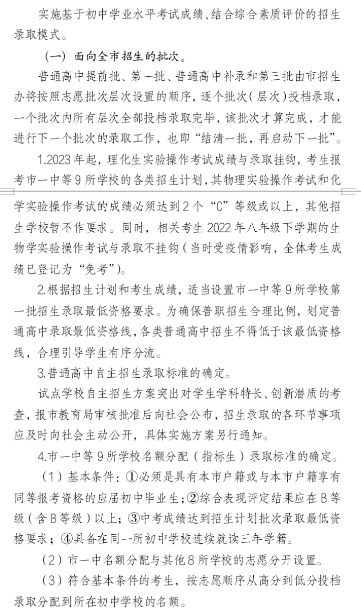 此外,为深化市一中等9所学校引领作用,市一中等9所学校以标杆示范效应,引领所在区域其他普通高中优质发展。市一中等9所学校设置第一批招生录取最低资格要求,保障头部优质高中生源质量,在高考为国家输送更多优质人才。2023年起,第一批面向全市招生学校按3年一个周期,根据办学质量水平和规范招生情况探索动态调节机制,激励全市普通高中力争上游提升办学质量,严格执行办学行为规范。