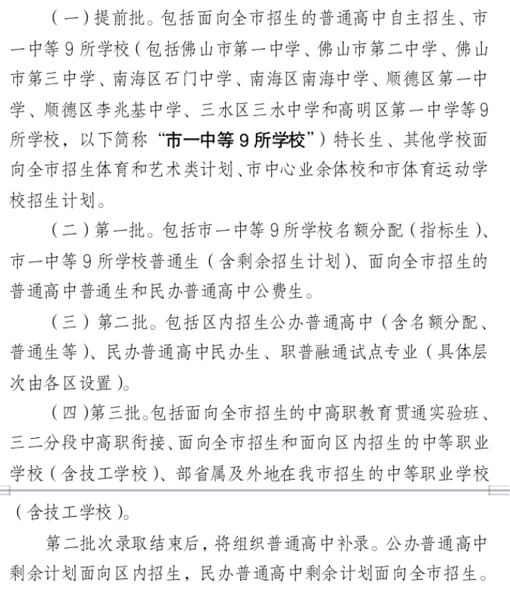 佛山市第四中学等20所公办普通高中安排20%至30%的普通生招生计划在第一批面向全市招生,具体招生计划由各区申请,报市教育局审批。经市教育局核准的民办普通高中公费生计划,安排在第一批面向全市招生。民办普通高中未经省教育厅批准不得跨市招生。