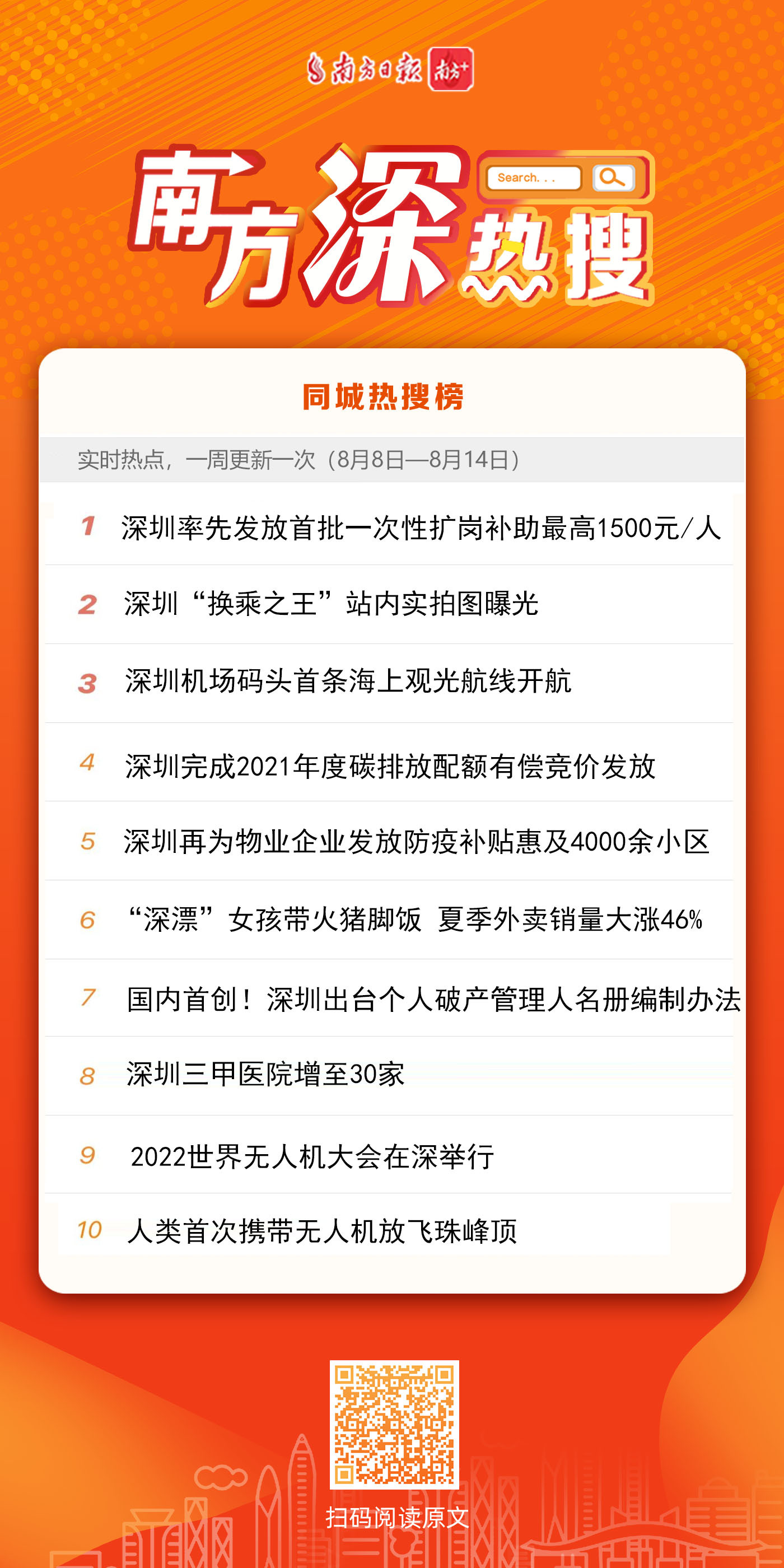这一周,民生工程陆续推进,深圳生活有保障。一碗简单的猪脚饭引来夏季外卖订单大涨,背后的故事大有文章;4条地铁线在这里穿过,岗厦北交通枢纽通车快了,实拍图曝光;深圳机场码头首条海上观光航线开航,前海之美尽收眼底;深圳首次开展碳配额拍卖工作,“双碳”工作翻开新的篇章;深圳三甲医院增至30家,大病不用离深已逐渐成真。