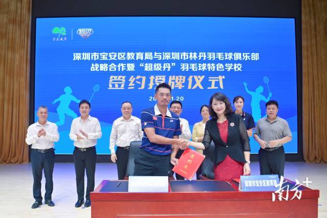 11月20日,深圳市宝安区教育局与深圳市林丹羽毛球俱乐部战略合作暨“超级丹”羽毛球特色学校举行签约授牌仪式。奥运冠军林丹、世界冠军谢杏芳出席仪式。