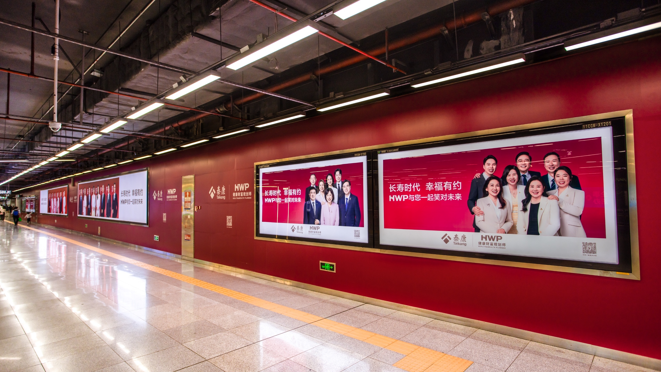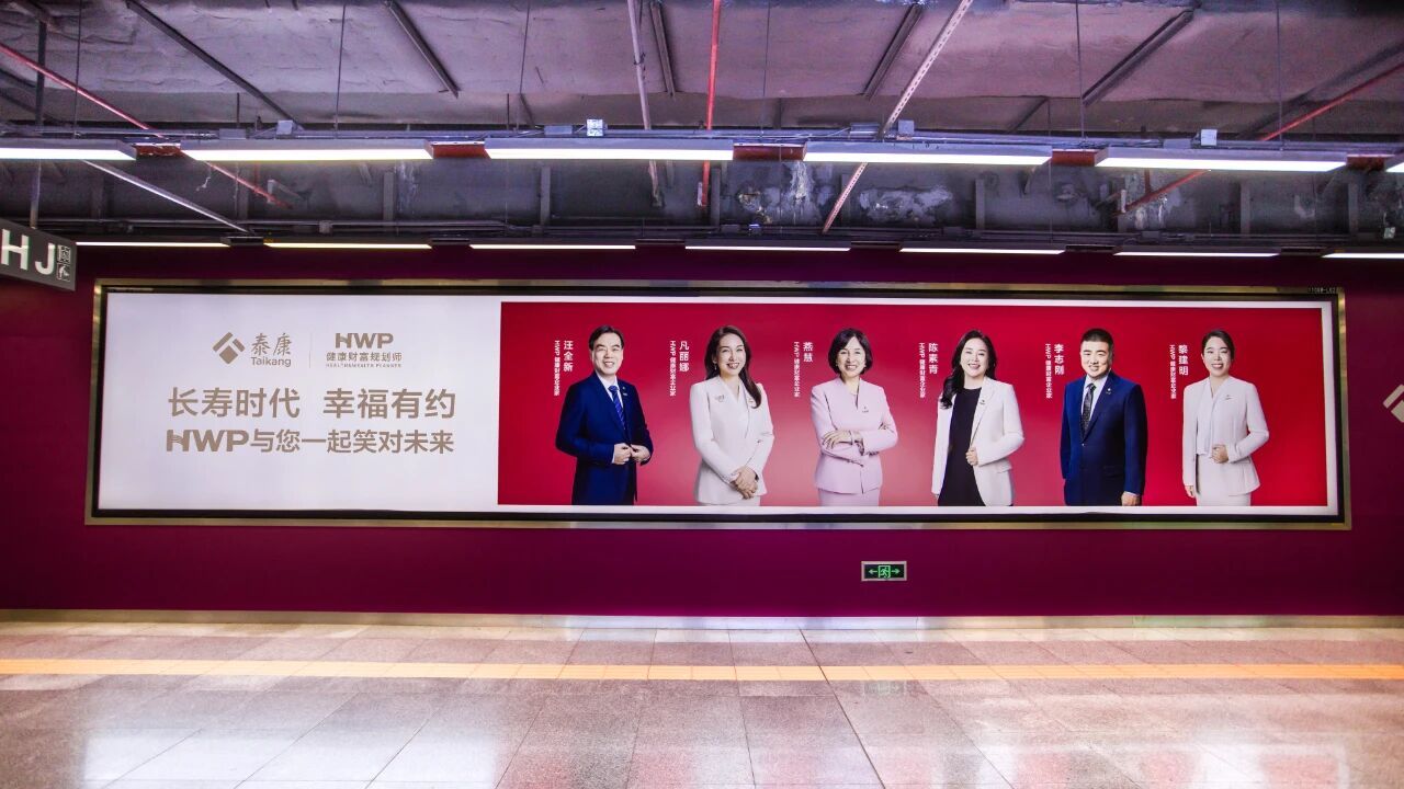 “HWP与您一起笑对未来”——灯光映照下,十余位身着职业装的泰康HWP(健康财富规划师)以自信从容的笑容面向通道,形成一面极具视觉冲击力的“笑脸墙”。