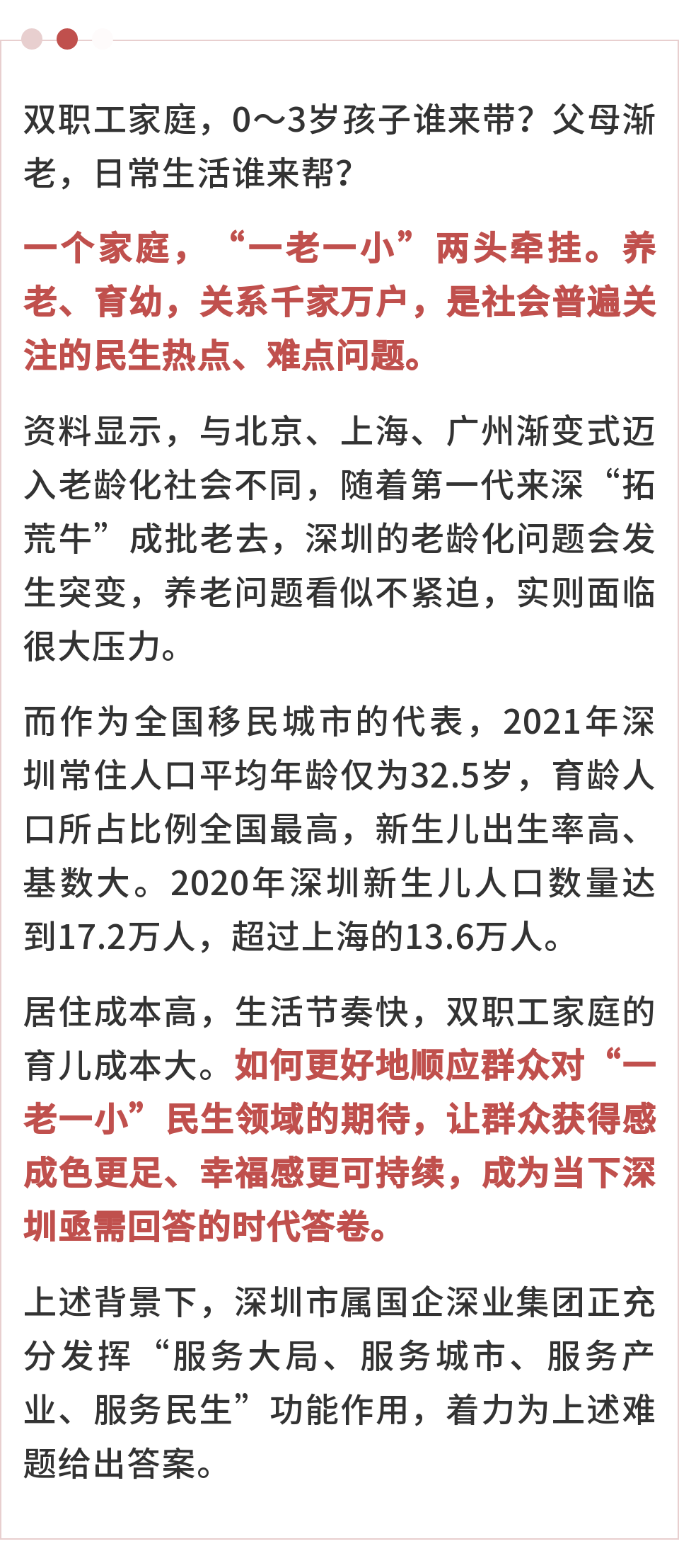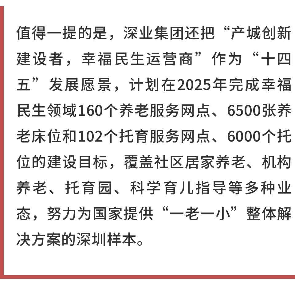 当前,深圳正在建设中国特色社会主义先行示范区,打造“幼有善育、学有优教、劳有厚得、病有良医、老有颐养、住有宜居、弱有众扶”民生幸福标杆城市,这一背景下,如何助力民生幸福标杆城市和“双区”建设,全面探索“一老一小”整体解决方案的深圳答卷,也成为深业集团坚定的奋斗目标。