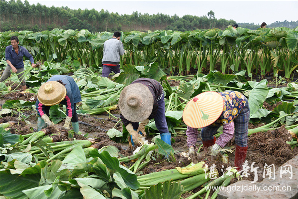 农户们收获芋头,场面热火朝天。