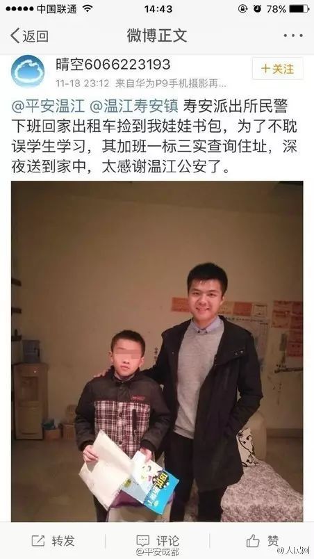 孩子的妈妈很是感激,在微博中晒出了孩子与民警的合影↓
