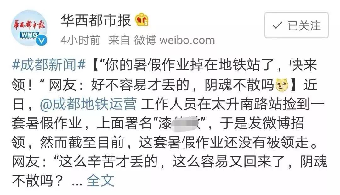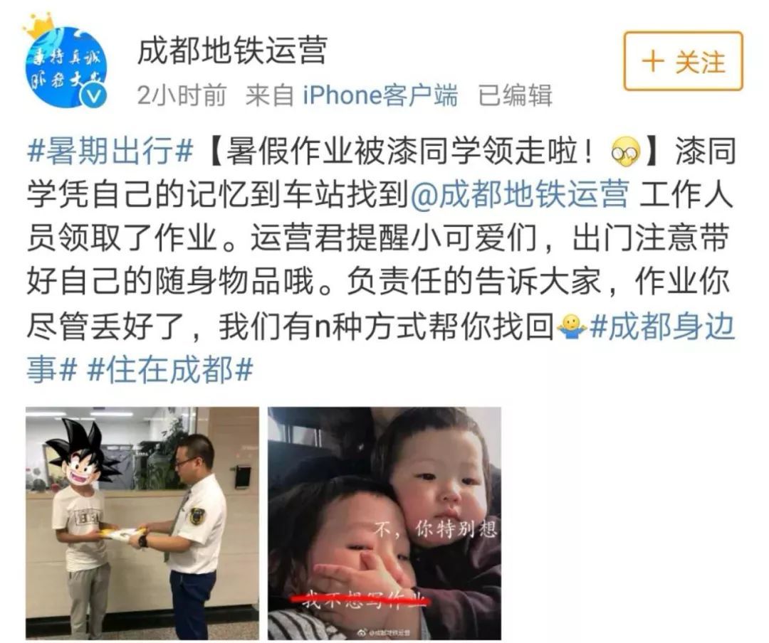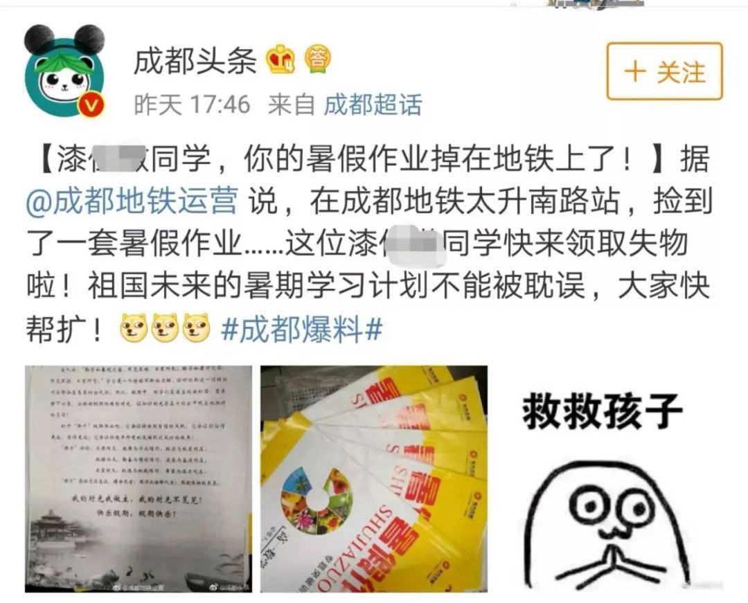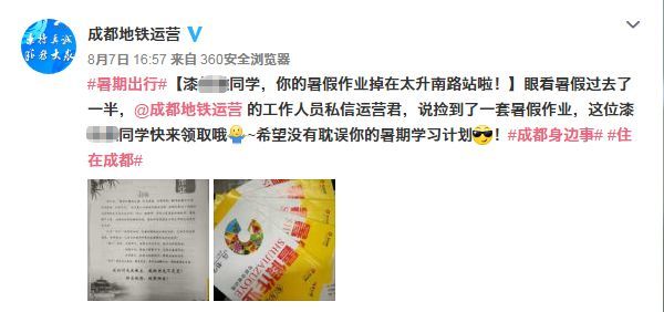 网友的力量是巨大的!时隔一天,8日下午,@成都地铁运营 发布微博称暑假作业已被漆同学领走,还负责任地告诉大家,作业你尽管丢好了,我们有N种方式帮你找回!