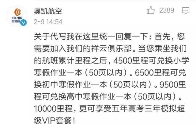 奥凯航空更加直接,乘坐奥凯航空累计里程可换寒假作业,更可享五年高考三年模拟的超级VIP套餐!