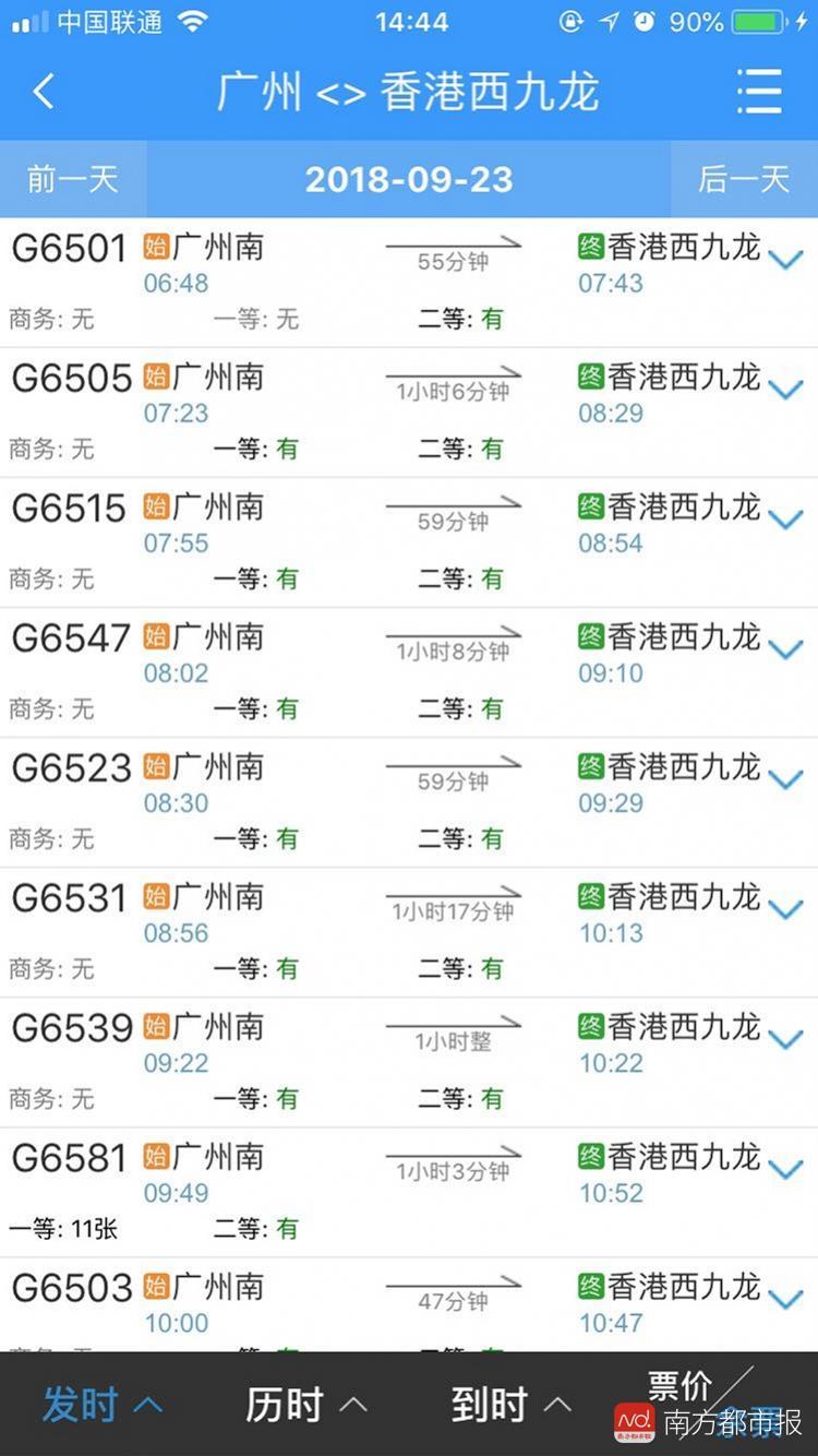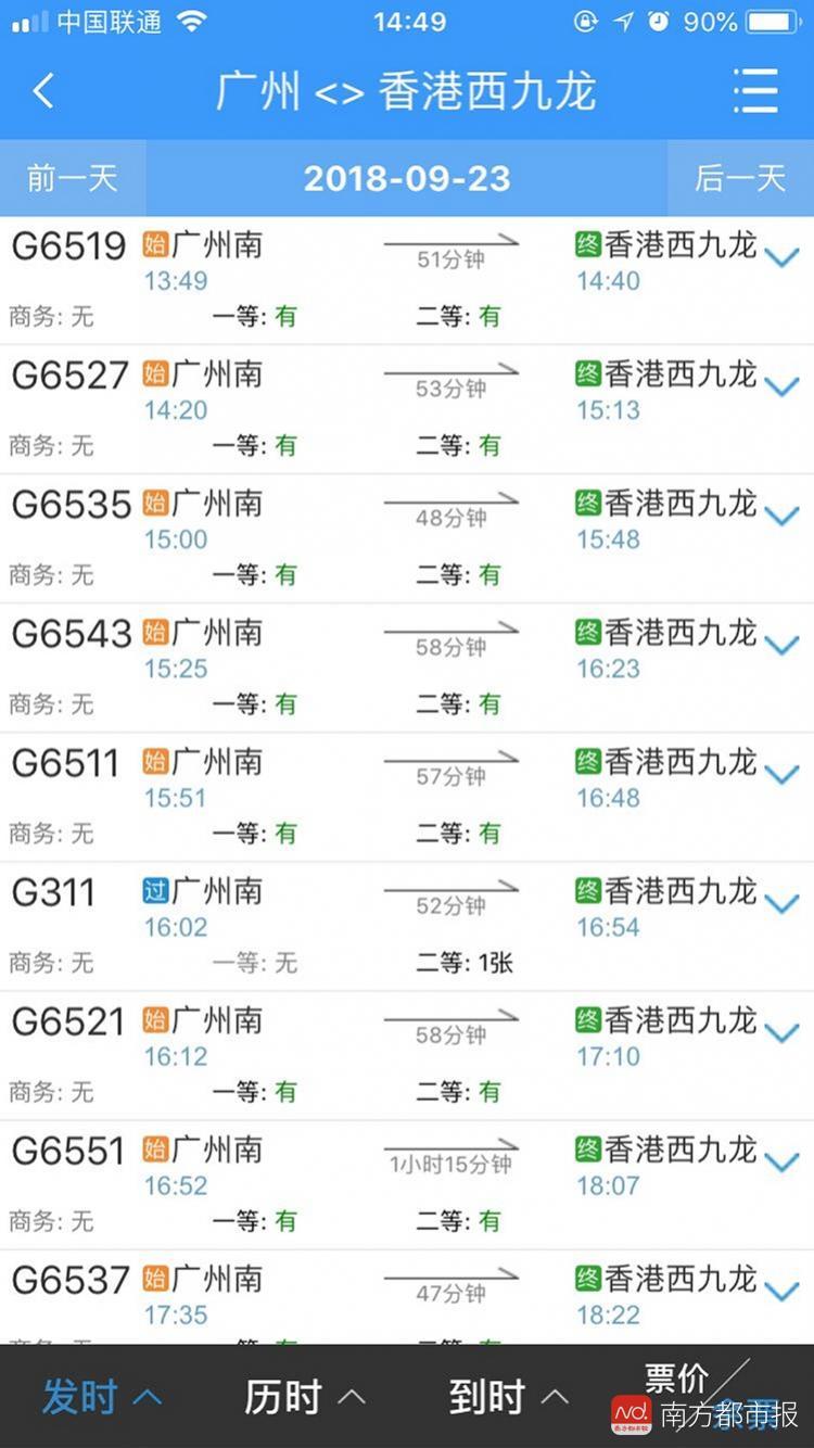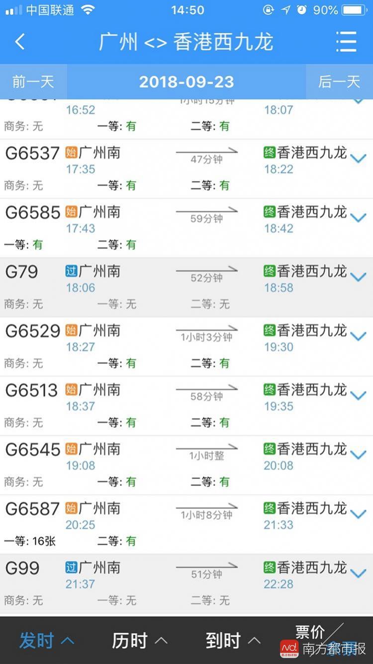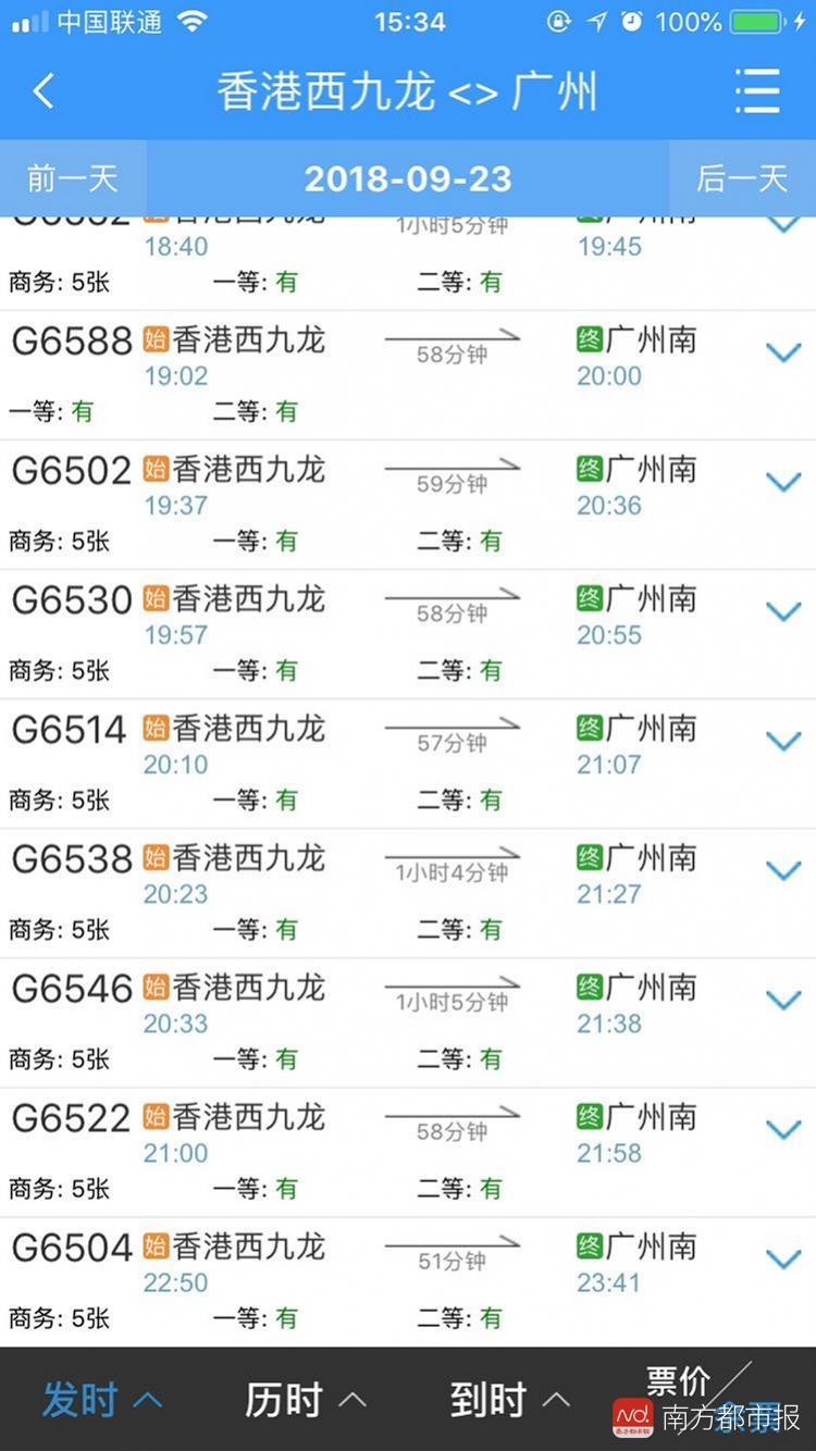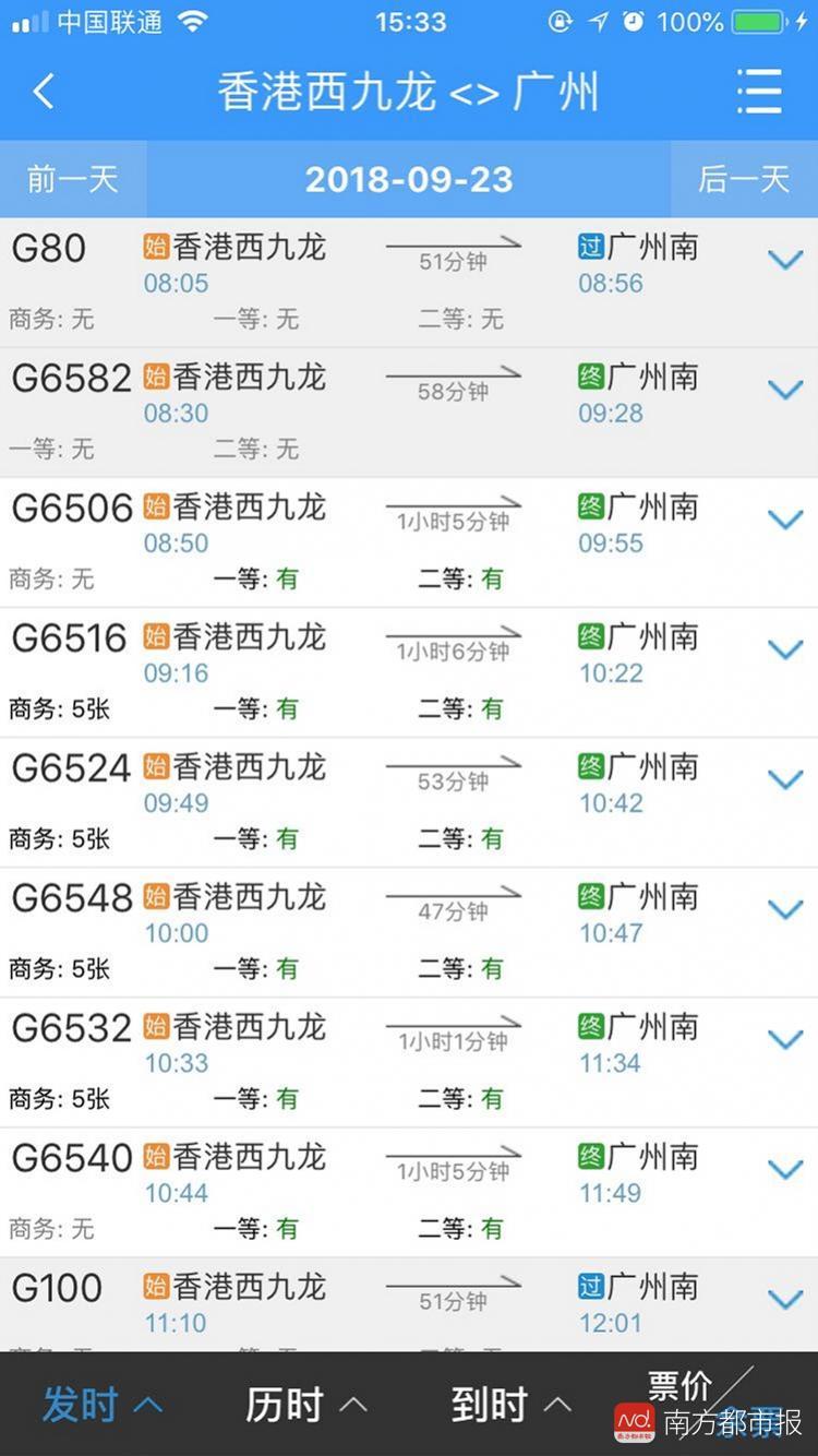 而从香港西九龙发往广州南方向9月23日的车次中,首班车8:05的G80所有车票均告售罄,当日末班车、22:50发车的G6504则仍有余票。