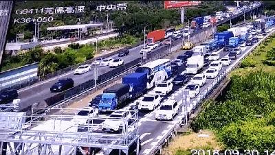 下午五点半,沙贝收费站附近,往粤西方向的车流顺畅,未见拥堵,相反入城方向出现行车缓慢车流。