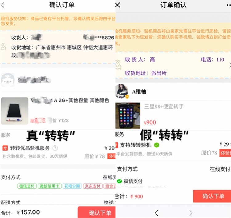 在确认订单页面,真假“转转”链接均有“验机服务须知”“验机体验价”“支付方式”等信息,但高仿页面的“支付方式”栏只支持微信支付。