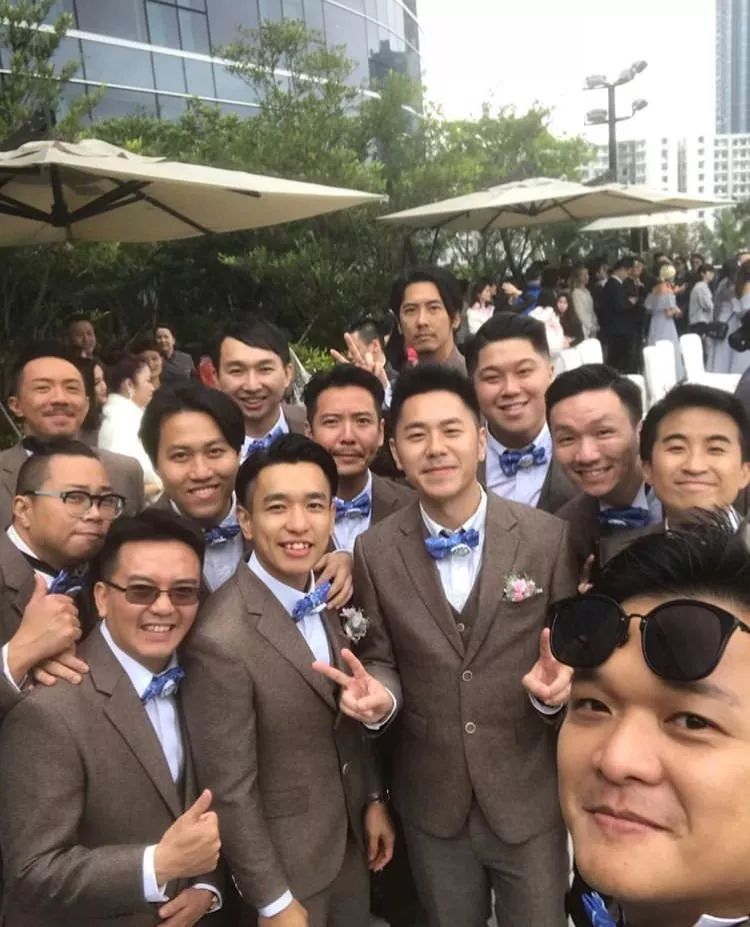 婚礼当天早上,新郎萧润邦以及兄弟团一同前往迎接新娘。先给大家介绍一下兄弟姊妹团总共17人,兄弟团有张继聪、JW(王灏儿)男友Tarzan、DJ当奴等。