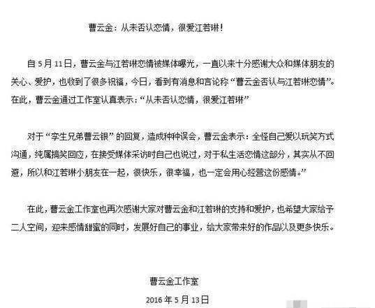 不过曹云金当时回应“那是我孪生弟弟曹云银”就被误会是否认恋情,之后他公开称自己很爱江若琳,正式官宣江若琳女友身份。