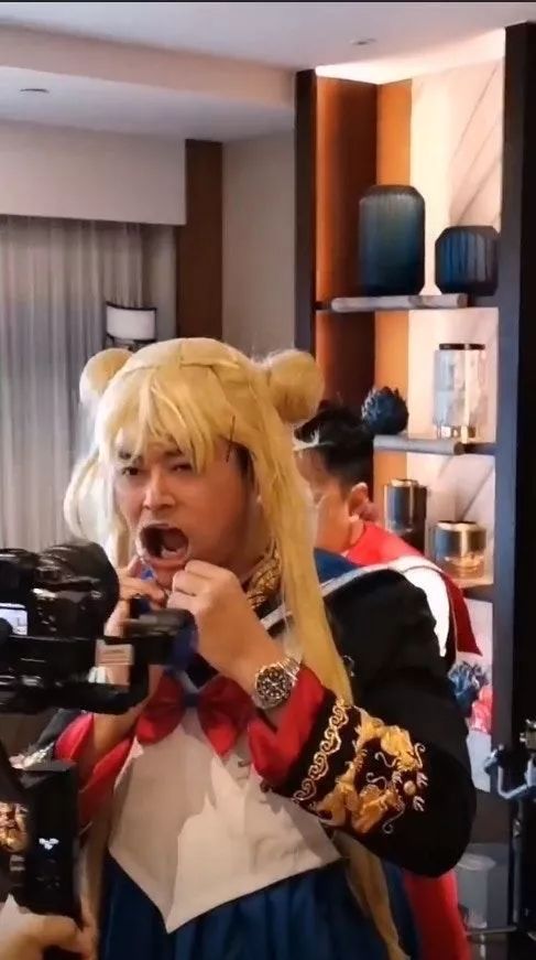 萧润邦被姊妹团要求戴上“口腔固定器”和金色假发,cosplay美少女战士,跟着江若琳的《Show You》MV又唱又跳。