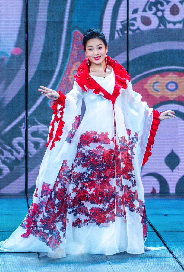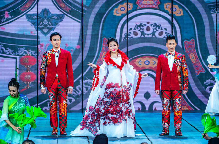 春晚舞台上,曾小敏一袭白色纱裙亮相,用水墨手绘一袭木棉花开凸显在白色的纱裙上,显得大气舒展,另两位男演员彭庆华及文汝清则一袭红色西装,帅气十足。
