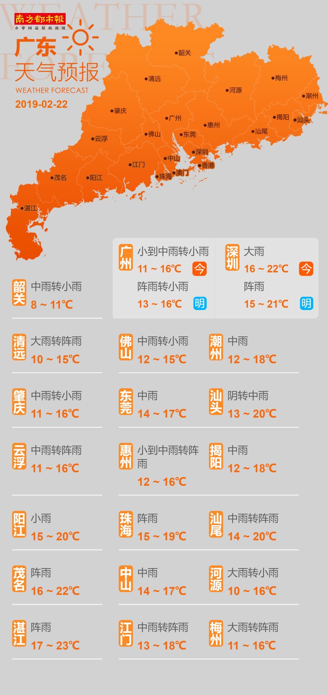 24日(周日),粤东市县阴天有中到大雨,其余市县小到中雨局部大雨。