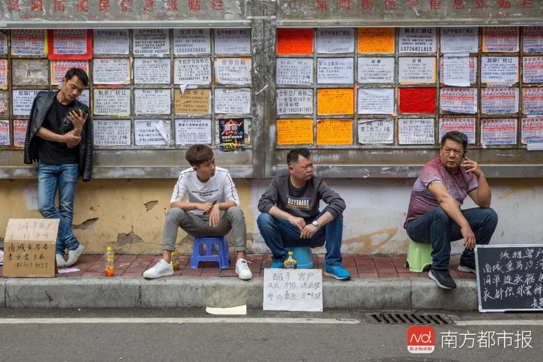 2月21日,广州康乐村,制衣小作坊的“老板”们在路边等候,他们打出的不是“招工”的牌子,而是“诚寻客户”等新年新订单,同时列出了工厂擅长的制衣类型和款式,期待周边服装产业链的相关从业者带着订单找上门来。而他们身后的信息张贴栏里,不少是制衣厂转让的小广告。南都记者 谭庆驹 摄