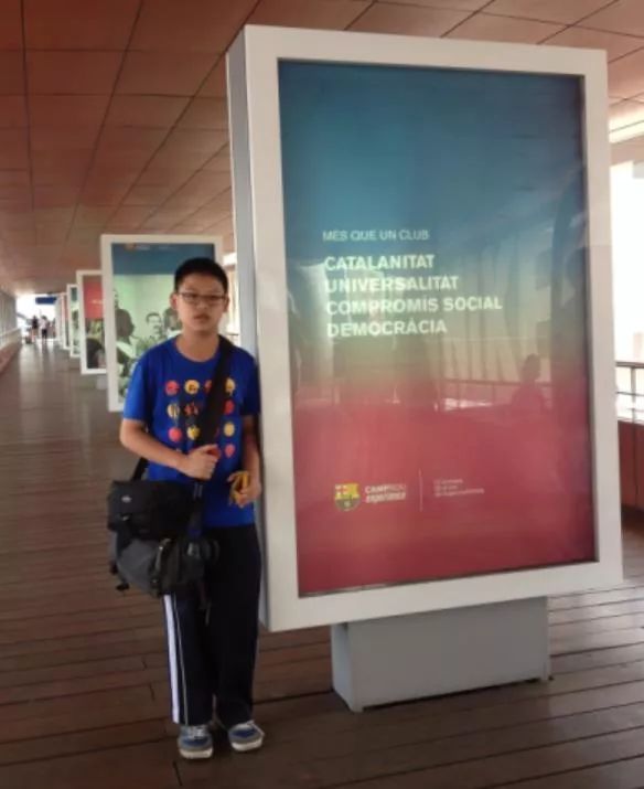 2013年,姚静和儿子何浩天在西班牙旅行,图为身穿深圳校服校裤的何浩天。