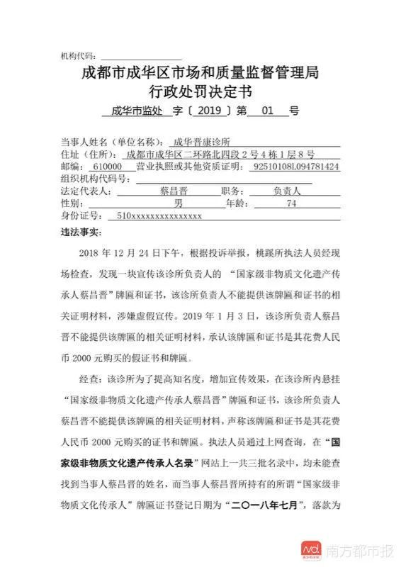 2月18日,四川成都市成华区市场监督局下发一份行政处罚书,确认位于成都的一家名为“成华晋康诊所”,宣传该诊所负责人的“国家级非物质文化遗产传承人蔡昌晋”的牌匾和证书为虚假宣传,对其罚款8000元。