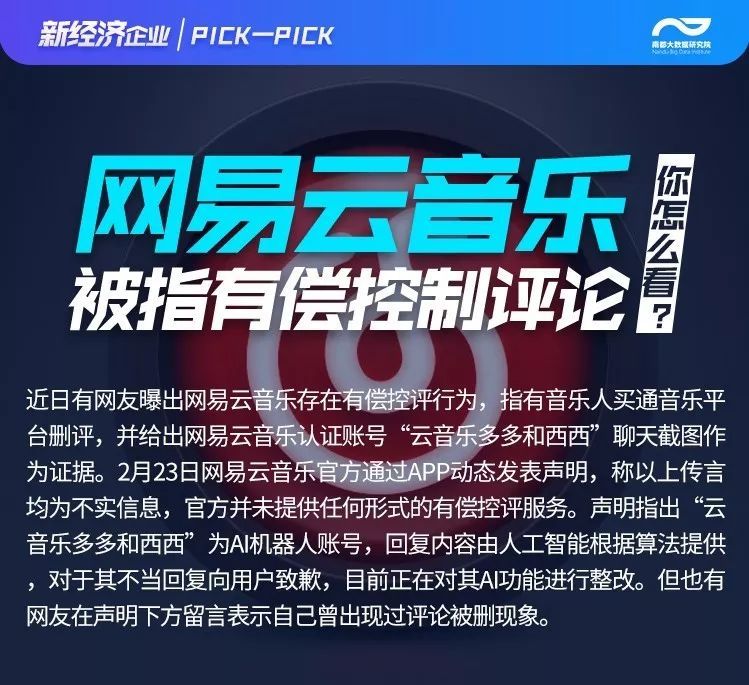 近日有网友曝出网易云音乐存在有偿控评行为,指有音乐人买通音乐平台删评,并给出网易云音乐认证账号“云音乐多多和西西”聊天截图作为证据。2月23日网易云音乐官方通过App动态发表声明,称以上传言均为不实信息,官方并未提供任何形式的有偿控评服务。对此你怎么看?戳下图投个票!
