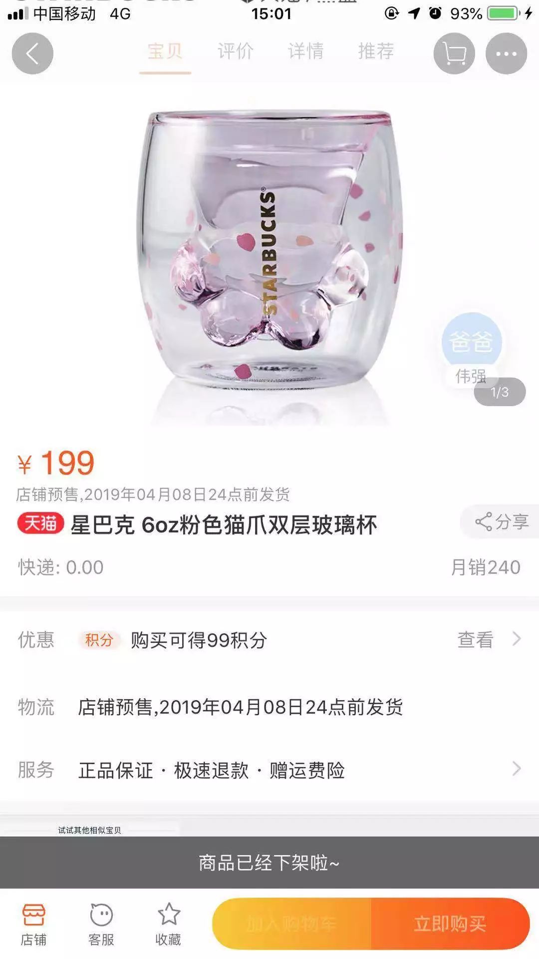 2月28日下午3点,在各地的星巴克引起“猫爪杯大战”的6oz粉色猫爪双层玻璃杯在星巴克天猫官方旗舰店正式开售,1000只猫爪杯在开售不到一分钟的时间内被“抢光”,网友表示“有种双11抢购的感觉”。