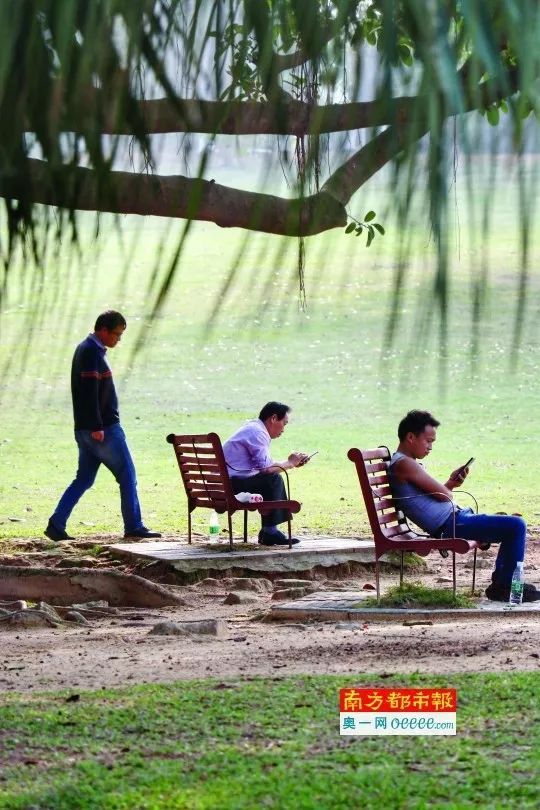 昨日下午,东莞市植物园,市民惬意地在树荫下休息,其中一人早早穿起了短背心。南都记者 方光明 摄
