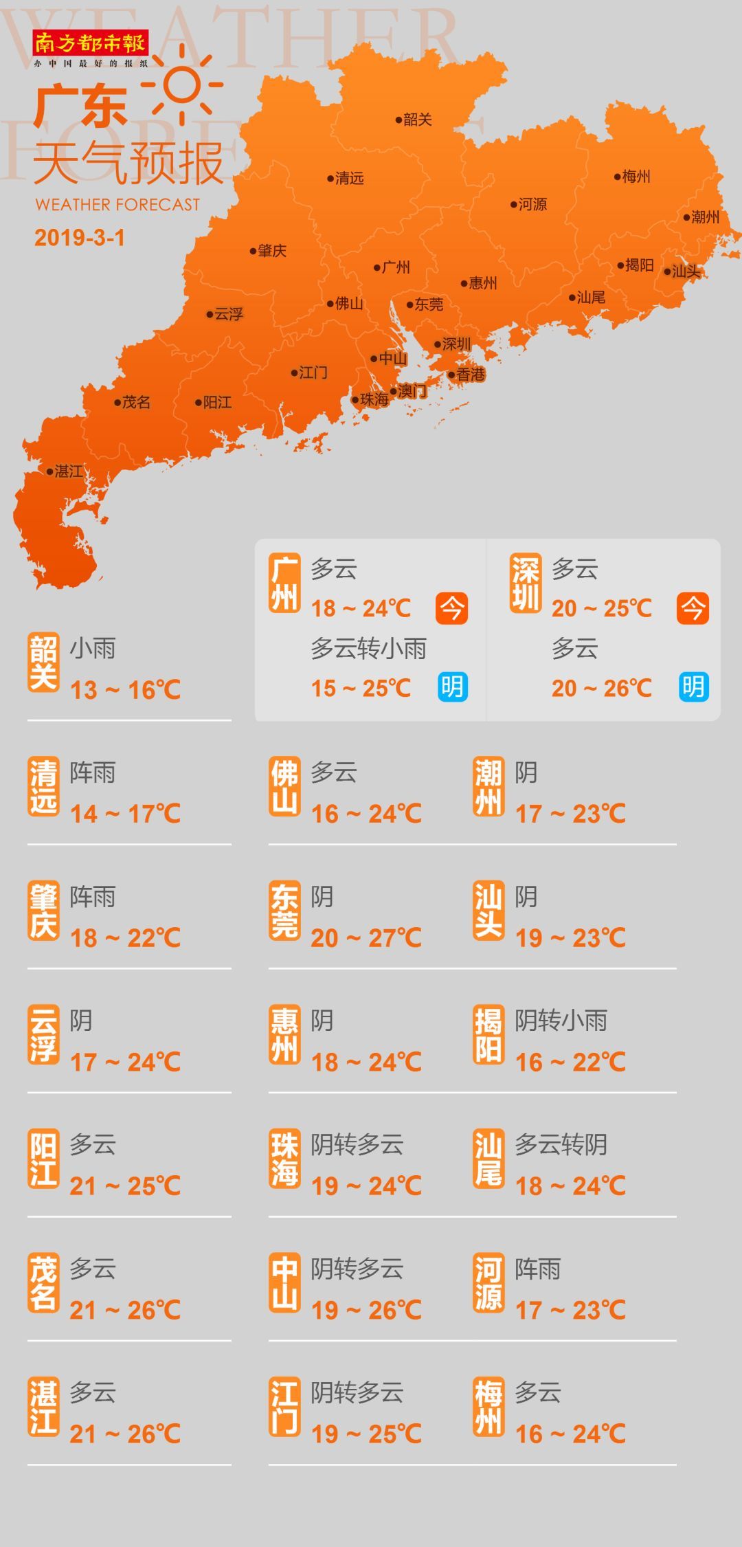 3月1日-2日白天,全省多云到阴天,局部有小雨,早晚有轻雾或雾,雾时能见度小于1公里。1日早晨最低气温:粤北大部市县11——14℃,粤西和珠江三角洲中南部市县18——22℃,其余市县15——17℃。