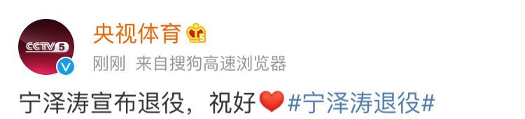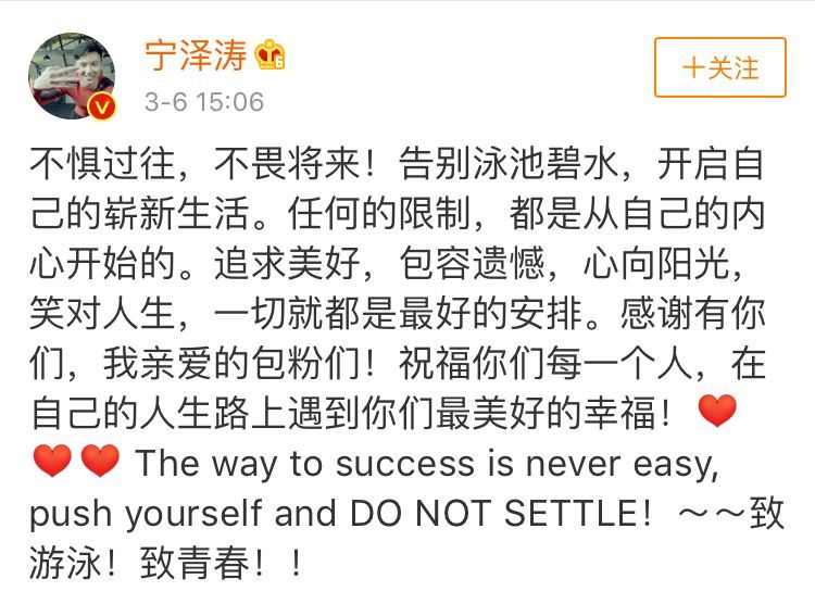 今天(6日)下午3时许,宁泽涛发了一则微博宣布退役: