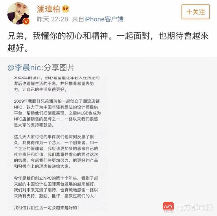 李晨在上述声明中提到,MLGB是潮牌NPC销售的品牌之一,后者由他和好友潘玮柏共同创立于2009年。李晨也再次提到MLGB商标的含义—“My Life’s Getting Better”。李晨发声后,潘玮柏也转发了他的微博并公开表示将一起面对,期待越来越好。