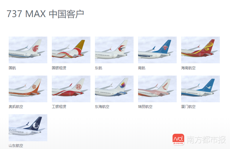 中国市场方面,截至2018年底,波音737 MAX交付给中国国内航空客户已超60架。据波音官网数据,波音737MAX的中国航司客户包括厦航、深航、山东航空、海航、南航等国内多家主流航空公司。南都记者注意到,除了航司外,还有国银租赁、工银租赁等航空租赁公司。