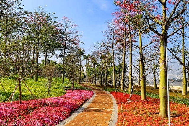 横琴花海长廊全长约13.6公里,顾名思义一路都有鲜艳绽放,主要以樱花木棉、凤凰木和木棉种植为主,特别是这个季节各种花开得热热闹闹,在花路上骑行,分外养眼。