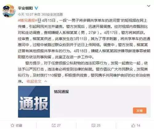 近日,一段“一男子将多辆共享单车扔进河里”的短视频在网上传播,引起网民关注并谴责。19日,北京市公安局朝阳分局官方微博发布通报称,经对视频内容甄别比对和走访调查,查明嫌疑人系柳某某(男,27岁)。17日,警方将其抓获。18日,嫌疑人柳某某因涉嫌寻衅滋事罪被朝阳警方依法刑事拘留,此案正在进一步工作中。(中新网)