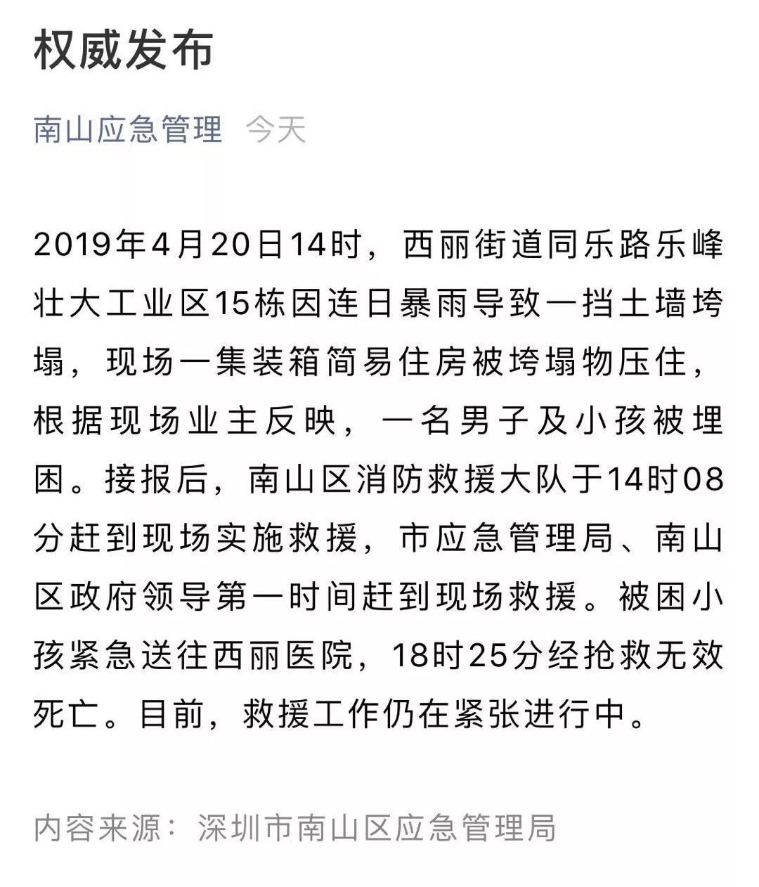 据深圳市南山区应急管理局通报,2019年4月20日14时,西丽街道同乐路乐峰壮大工业区15栋因连日暴雨导致一挡土墙垮塌,现场一集装箱简易住房被垮塌物压住,根据现场业主反映,一名男子及小孩被埋困。