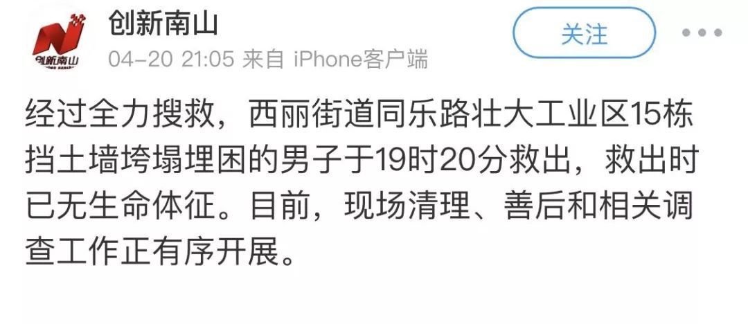 19时20分,经过全力搜救,西丽街道同乐路壮大工业区15栋挡土墙垮塌埋困的男子被救出,救出时已无生命体征。