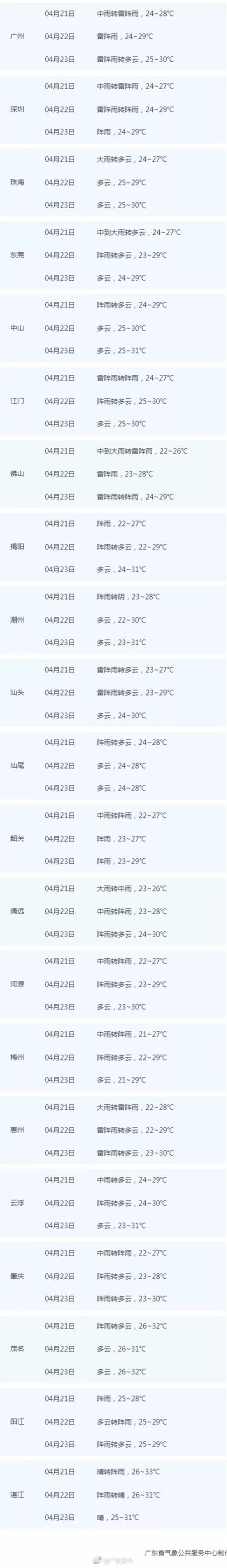 23至24日,粤北市县有(雷)阵雨局部大雨,其余市县有雷阵雨转阴天到多云。