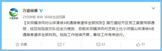 南都记者从重庆市万盛经济技术开发区外宣办获悉,4月19日下午万盛经济技术开发区关坝镇山体滑坡中失踪的4人,在20日下午全部找到,4人全部遇难。