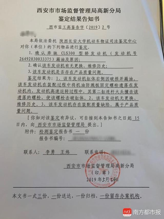 5月27日上午,W女士向南都记者表示,她已收到西安市市场监督管理局高新分局出具的《鉴定结果告知书》,涉事奔驰车“发动机存在装配质量缺陷,属于产品质量问题”。