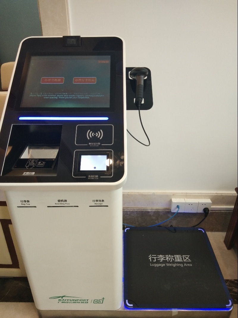 琶洲城市候机楼内行李称重与托运办理机。