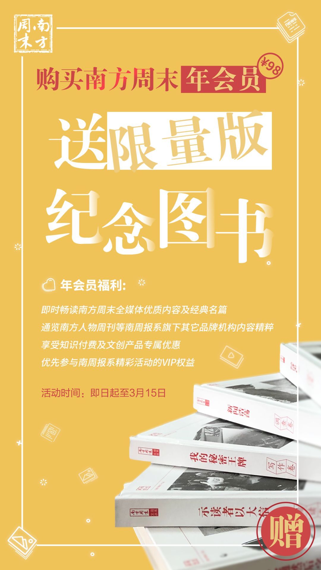 即日起至3月15日,只要购买或续费南方周末年会员,限量版南周纪念图书你可以任选一本带回家,邮费由我们承担。距离活动结束仅剩最后3天。