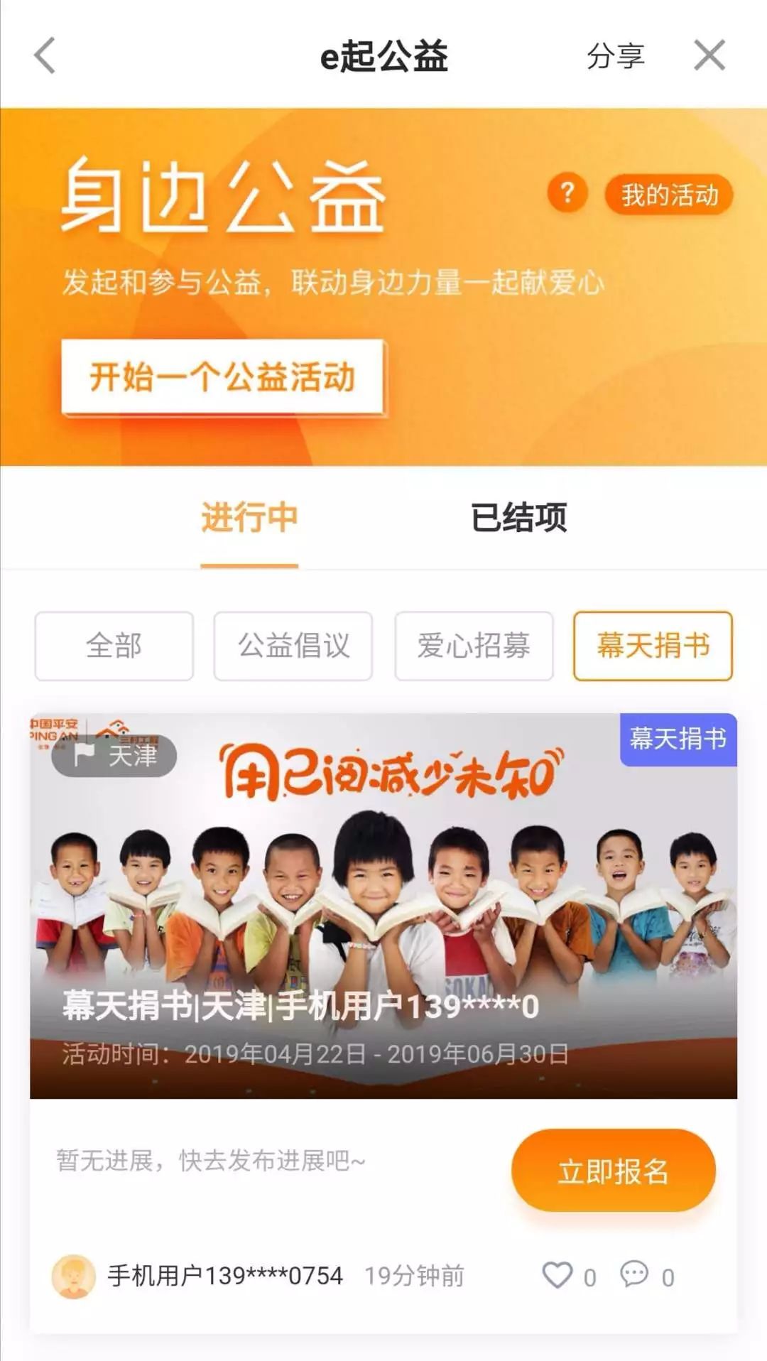 依托于平安金管家“e起公益”平台,“身边公益”作为其中重要的版块之一,为广大平安志愿者和公众提供了一个随手公益的机会。短短半个月时间,来自全国各地的四千名平安志愿者加入到阅读公益的爱心热浪中,发起近五千场捐书活动,吸引了千名客户朋友报名参与。