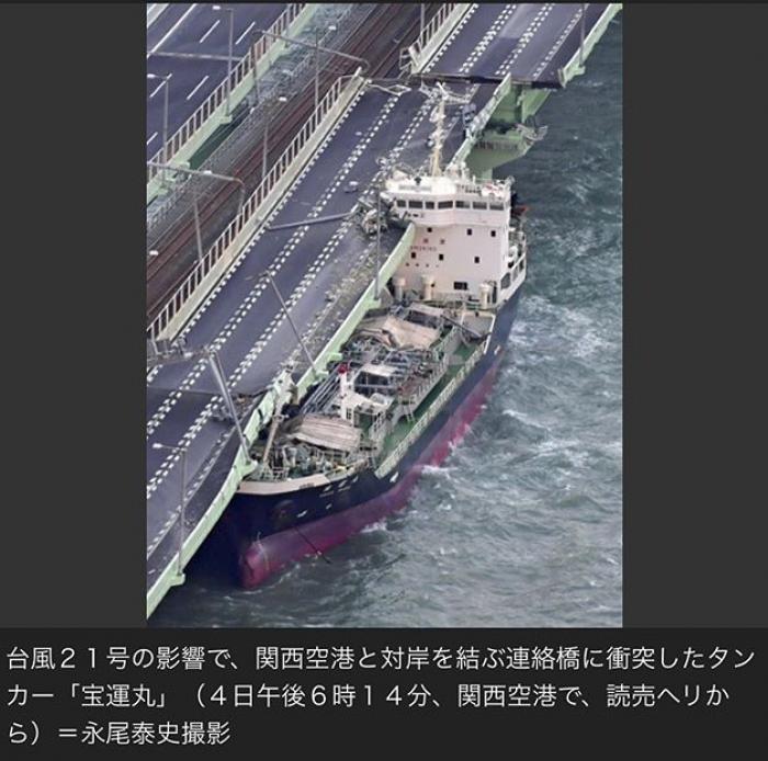 关西机场建于人工岛上,与陆地唯一的陆路通道就是一座联络桥。而就在昨日下午,宝运丸号油轮撞击关西机场与陆地唯一的联络桥断裂导致车辆无法通行,旅客等约5000人被困。5日清晨起,将滞留旅客运送至神户机场的高速船开始临时运航。而目前联络桥北侧已经恢复通行,机场组织大巴车外运滞留旅客,但不对公众车辆开放。