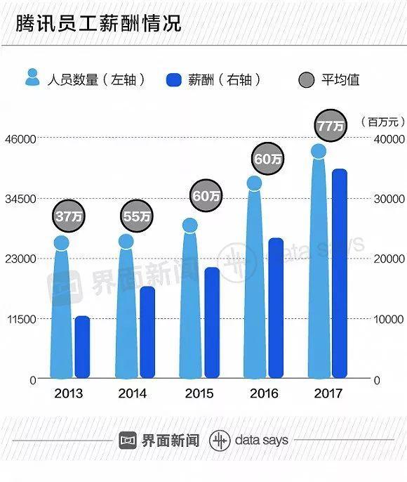 随之增长的还有人均薪酬。腾讯的人均年薪酬从2013年的37万元增长到了77万元,增长率为108%。