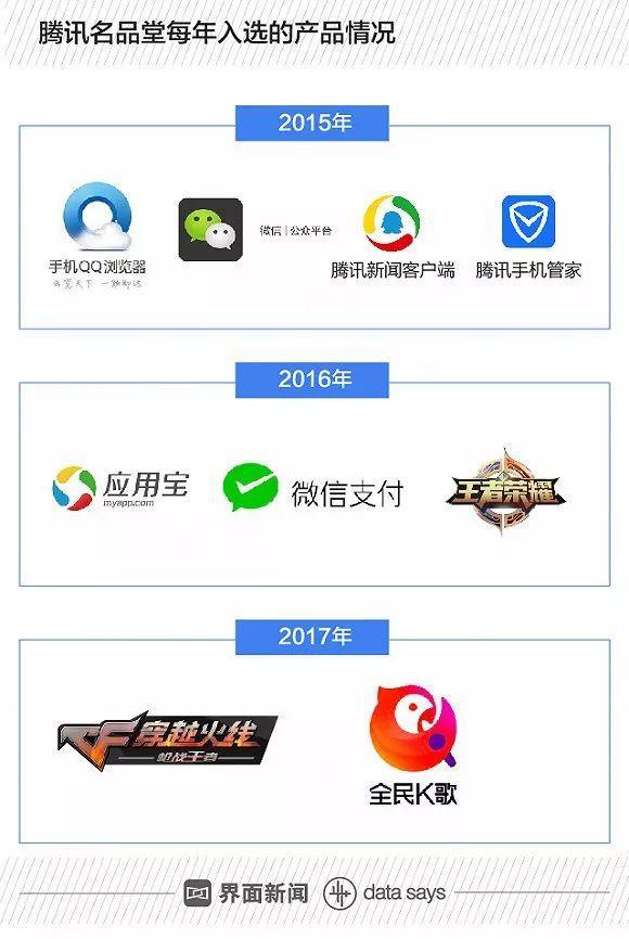 以腾讯的这几年的名品堂为例,2015年,手机QQ浏览器 、微信公众平台、腾讯新闻客户端、腾讯手机管家4款产品登上了殿堂。到了2017年,则只有2款产品,穿越火线手游和全民K歌。