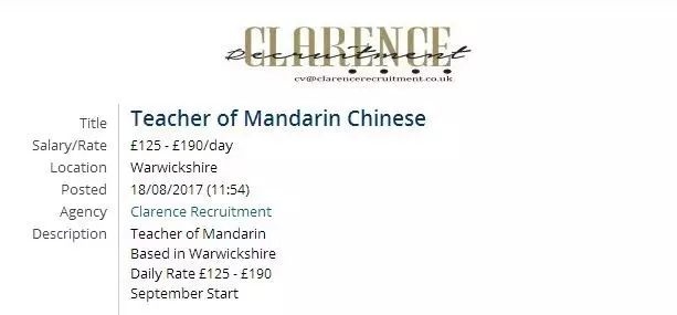 每经小编(微信号:nbdnews)在招聘网站Clarence发现,英国华威郡一所机构为招募普通话教师,开出了125-190英镑的日薪,并且薪水每日结账。