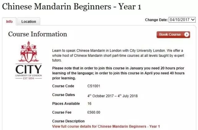 以伦敦城市大学针对零基础学院开办的中文入门课程为例,课时费为每小时30英镑。如果完整参加一个学年的“模块课程”,价格可以优惠到约等于六折的水平,总计560英镑(约合人民币4800元)。