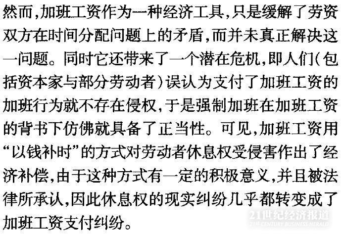 不过,在现实中,劳动者更重视是否支付了加班费。有学者统计,休息权的现实纠纷几乎都转变成了加班工资支付纠纷。