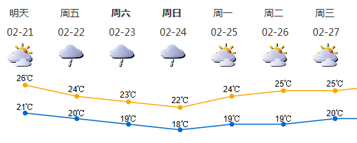 20-21日多云,部分时间有分散小雨,早晚有轻雾或雾,20日气温20-27℃;22日阴天有小雨;23-24日弱冷空气影响,持续阴雨天气,气温下降,沿海和高地阵风7-8级;25-27日可见阳光,气温上升。