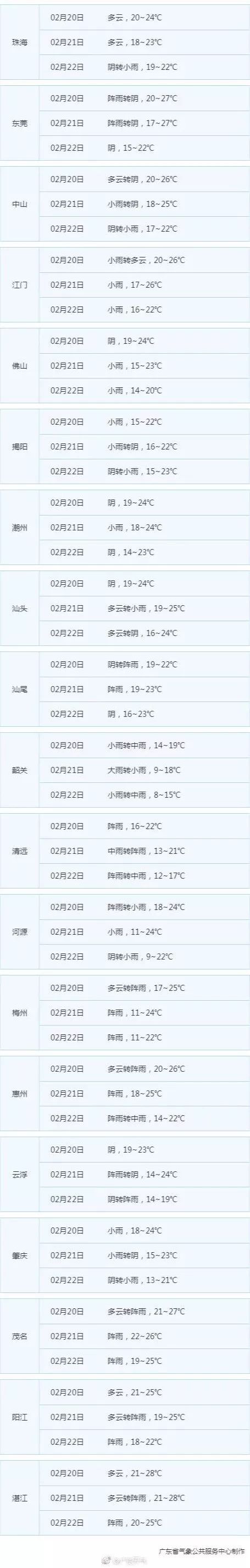 明晚弱冷空气到,明后天粤北和珠江三角洲的北部市县有大雨局部暴雨,部分市县伴有雷电、短时强降水和局部雷雨大风或局地冰雹等强对流天气,日平均气温将下降3~5℃。还没完,23~24日,受短波槽+弱冷空气补充影响,粤北和珠江三角洲的北部市县阴天有中到大雨。