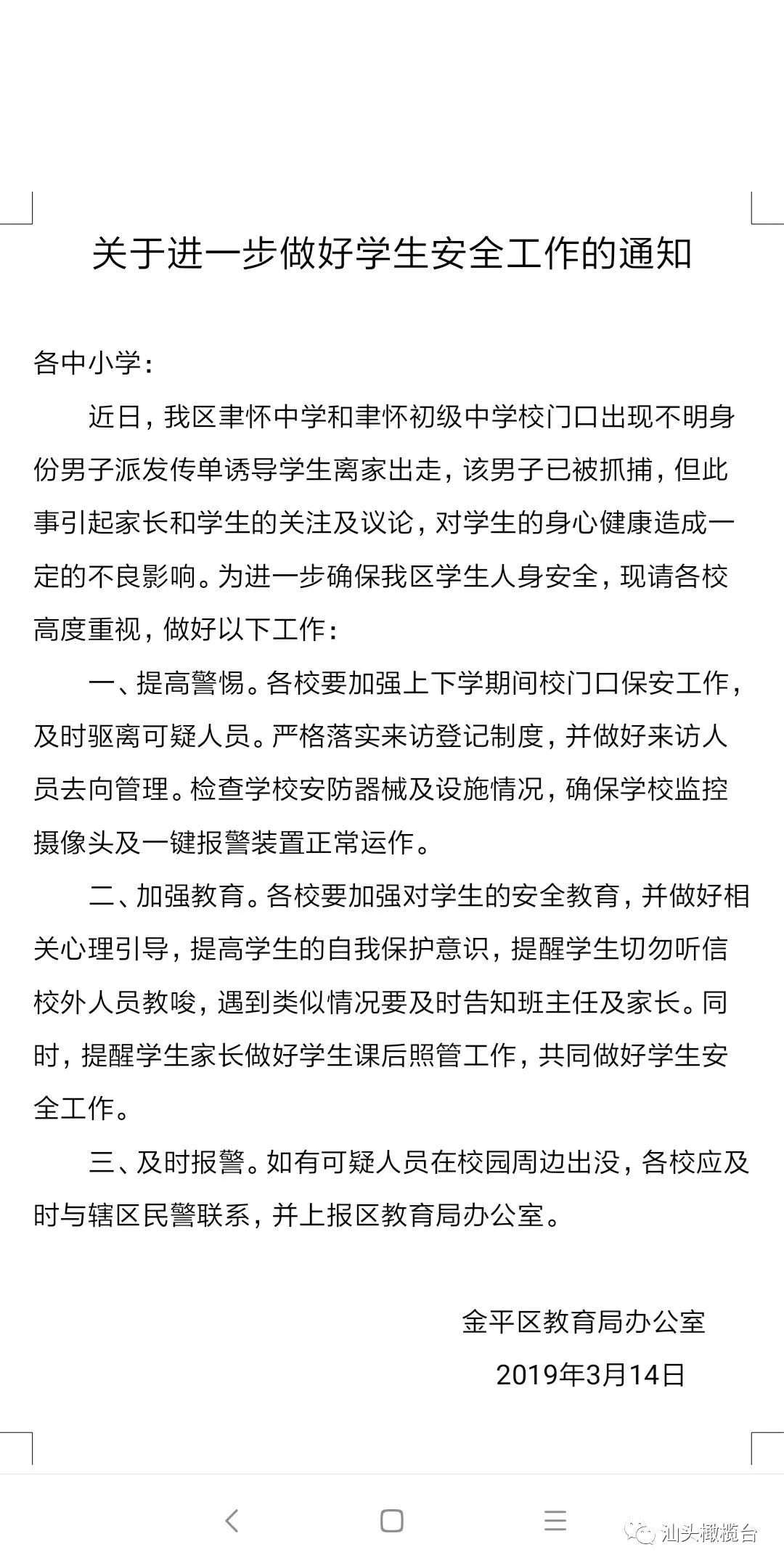 金平区教育局办公室发布《关于进一步做好学生安全工作的通知》(下文简称《通知》),要求各中小学高度重视,提高警惕,进一步确保学生人身安全。