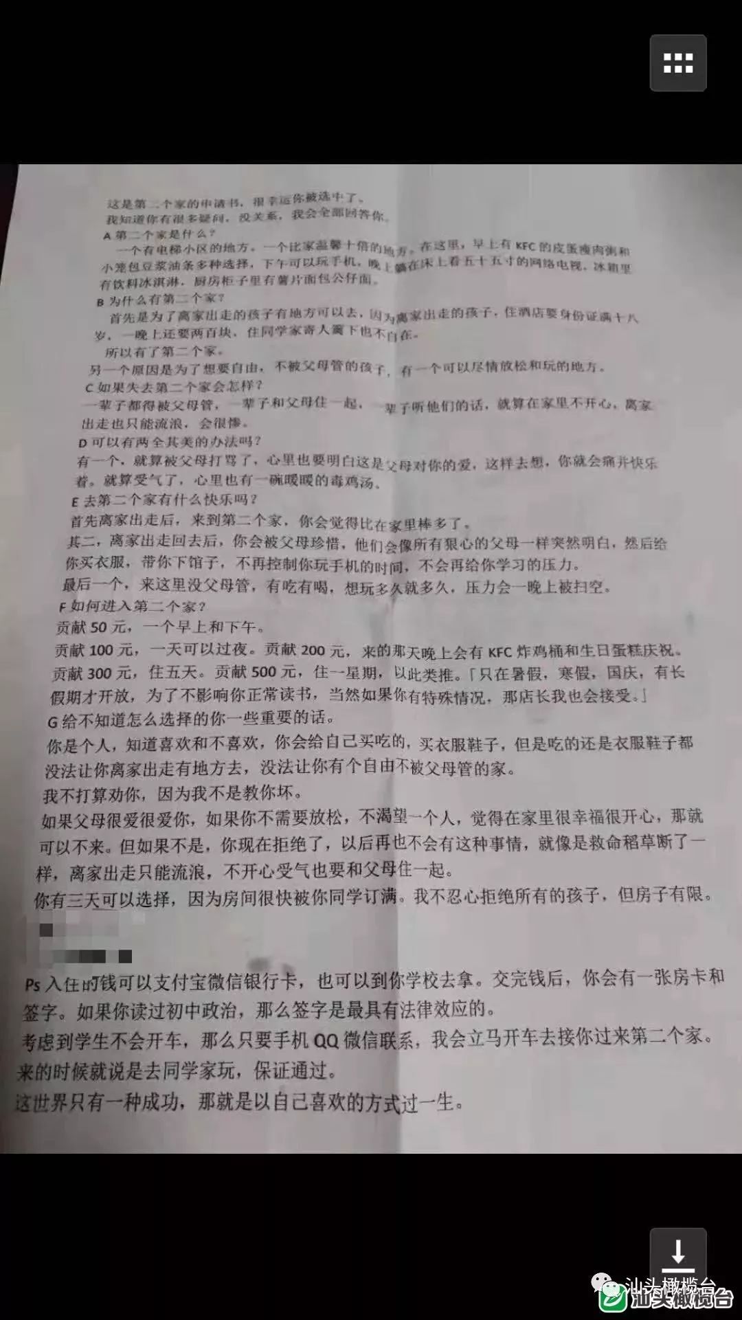 原来,这份传单充满各种诱导孩子离家出走的字眼,称能给离家出走的孩子提供所谓的“第二个家”。还写明,支付50元至500元不等,可以在那里住半天到一个星期,有得吃有得玩。