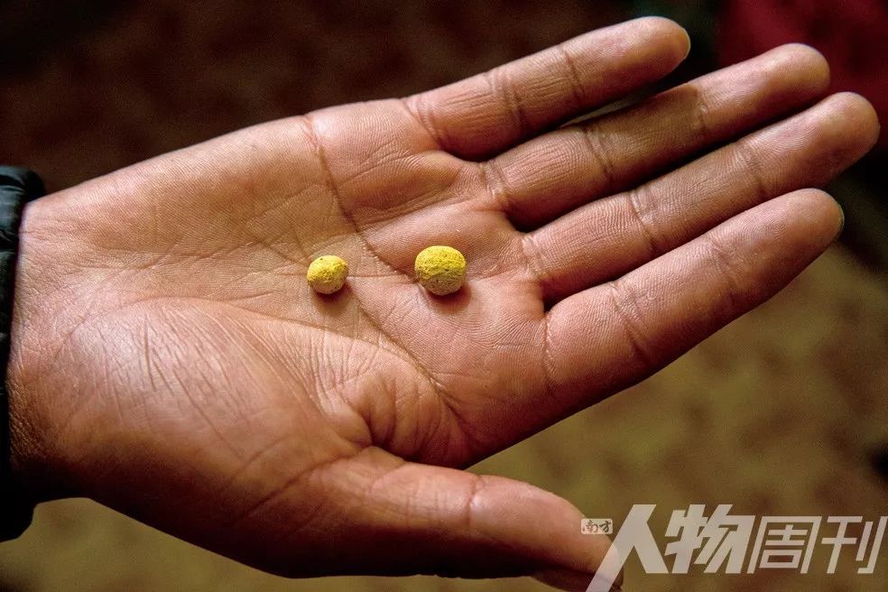 一名处理金矿石的人员手上拿着两颗经过部分加工的黄金。汞被烧掉以后,纯金就会留下来