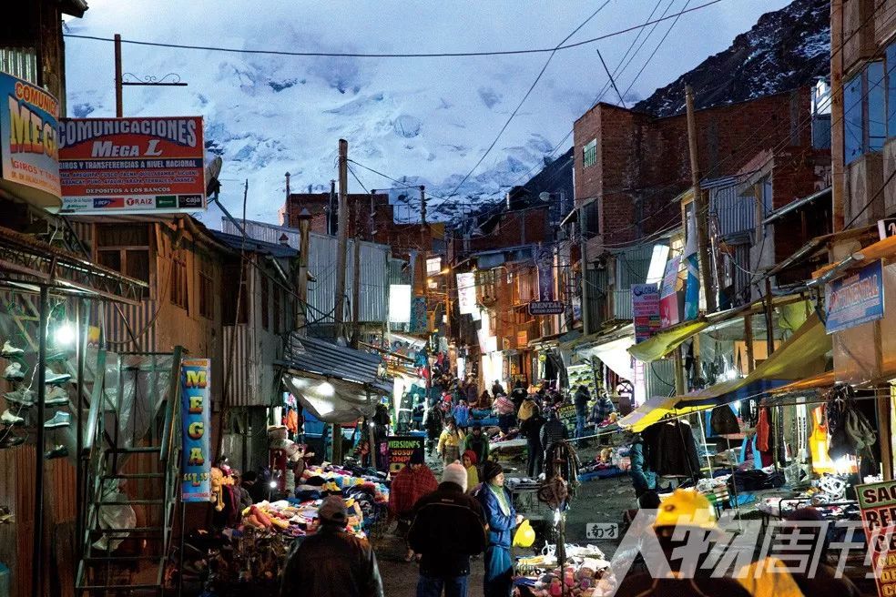 拉林科纳达城,位于秘鲁安第斯山脉树线以上,海拔约5100米,空气稀薄,是现今世界最高的人类永久聚居地,乘卡车翻越崎岖危险的山路才能抵达。